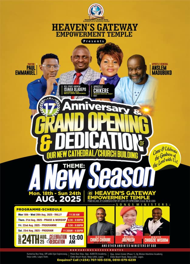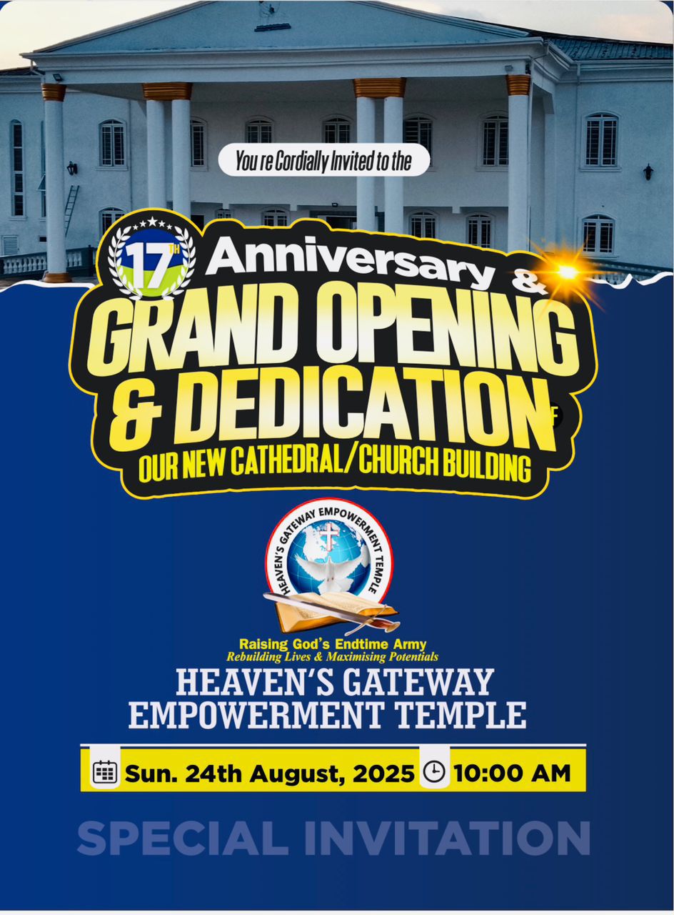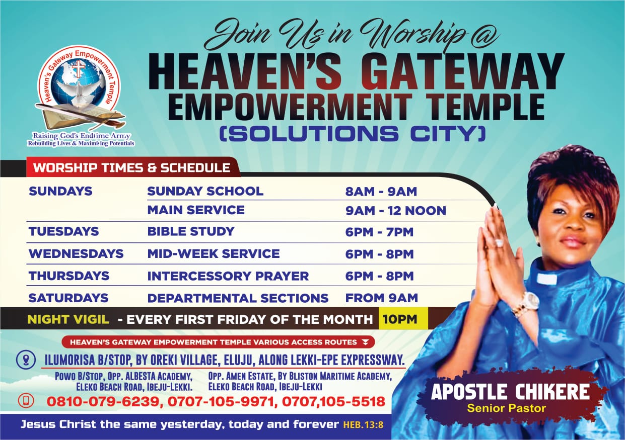 Heaven’s Gateway Empowerment Temple: ``Raising God's End Time Army, Rebuilding Lives and Maximising Potentials`` with the nations of the world. Under the guidance of the Esteemed Amiable and Indomitable - Pastor Chikere Onuigbo Nwafor, the Church has successfully grown into a religious force that spans the entire world, making the divine knowledge of the Lord available to millions worldwide.